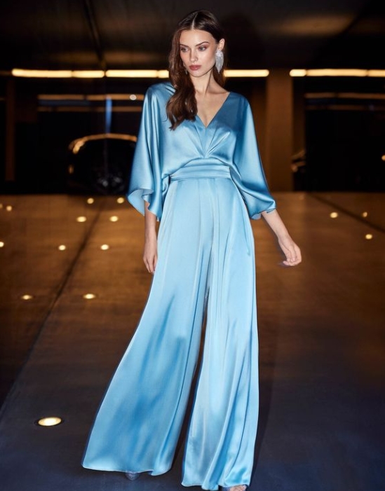 Mono de fiesta largo. Hecho de satén. Con escote en v, decoración de lazo en la parte trasera y mangas. Disponible en verde.