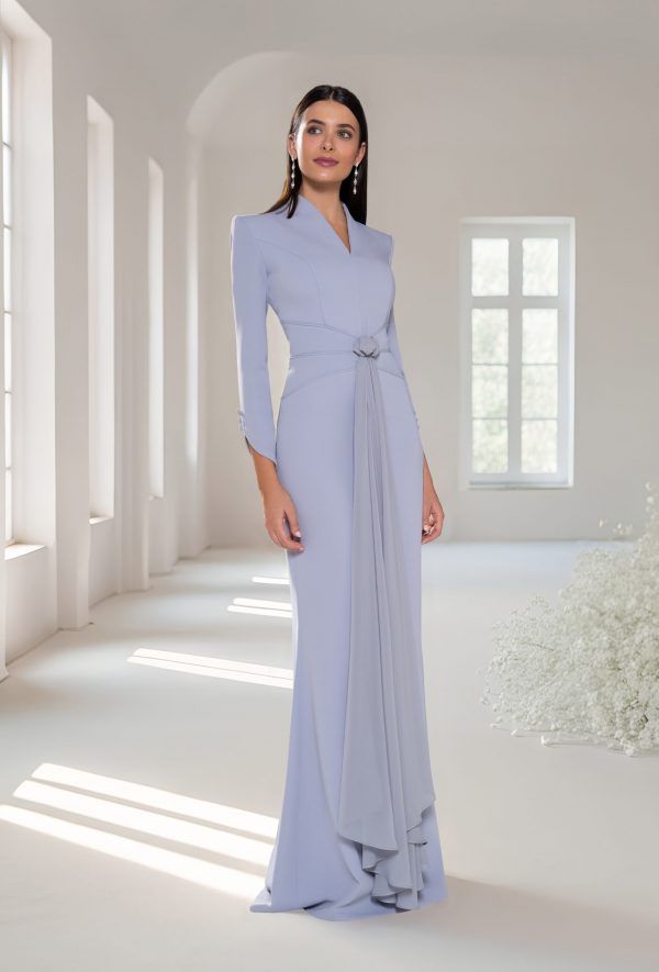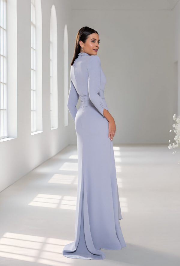 Confeccionado en crespón gris, el vestido presenta un cuello princesa que enmarca el escote con suavidad, aportando una línea clásica y favorecedora. Las mangas largas, perfectamente entalladas, acompañan una estructura con cortes estratégicos en el talle, realzados por vivos que perfilan la figura y estilizan con precisión.