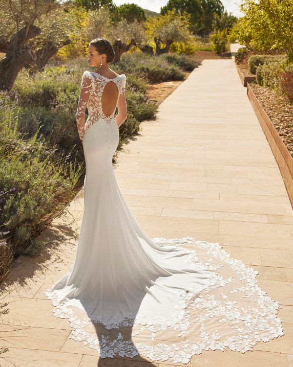 Vestido de novia largo sirena en crepé bielástico con cuerpo de encaje, pedrería, escote profundo, mangas extraíbles, espalda descubierta y cola de encaje.