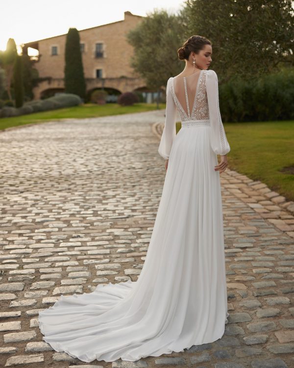 Vestido de novia confeccionado en georgette, falda capa, escote profundo y espalda abotonada. Se completa con unas mangas largas con encaje.