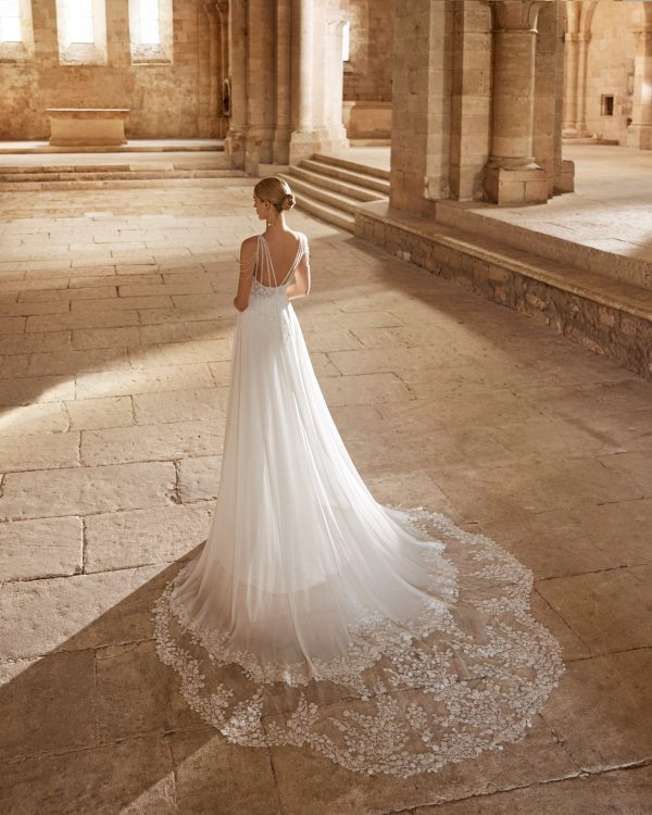 Vestido de novia, confeccionado en georgette. Con cuerpo de encaje, escote barco y tantes. Espalda escotada con tirantes de pedrería.