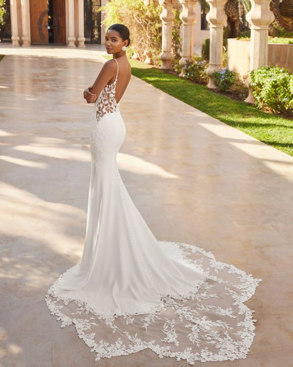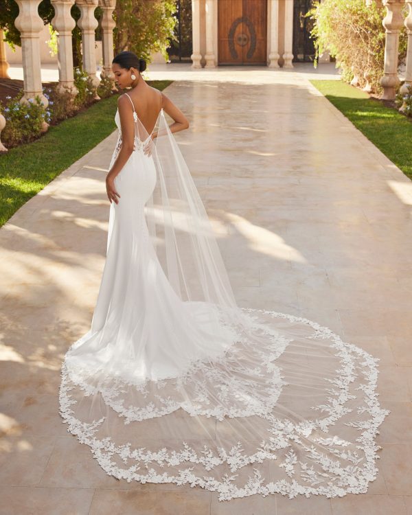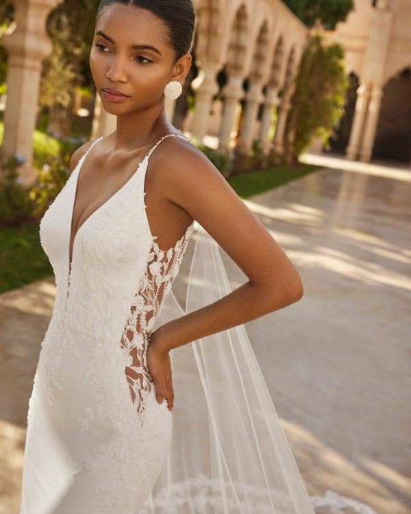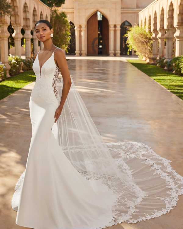 Vestido de novia largo, dos piezas, corte sirena. Confeccionado en crepé bielástico con cuerpo de encaje y pedrería, escote profundo, espalda en V, cola de encaje y capa.