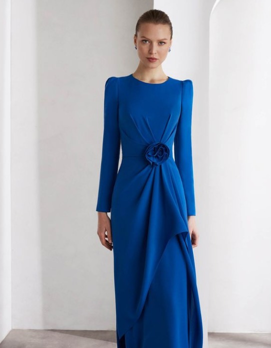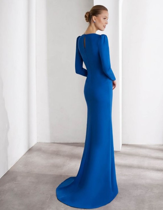 Vestido de fiesta largo. Confeccionado en crepé fino y manga larga.